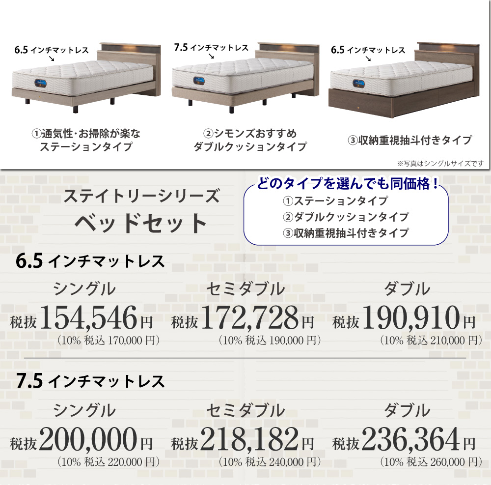 ![]() 7.5インチマットレス シングル 税抜200,000円 セミダブル 税抜218,182 ダブル 税抜236,364円 | |