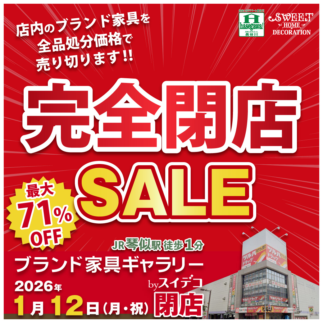 店内のブランド家具を全品処分価格で売り切ります!! 完全閉店セール ブランド家具ギャラリーbyスイデコ 2026年1月12日(月・祝) 閉店