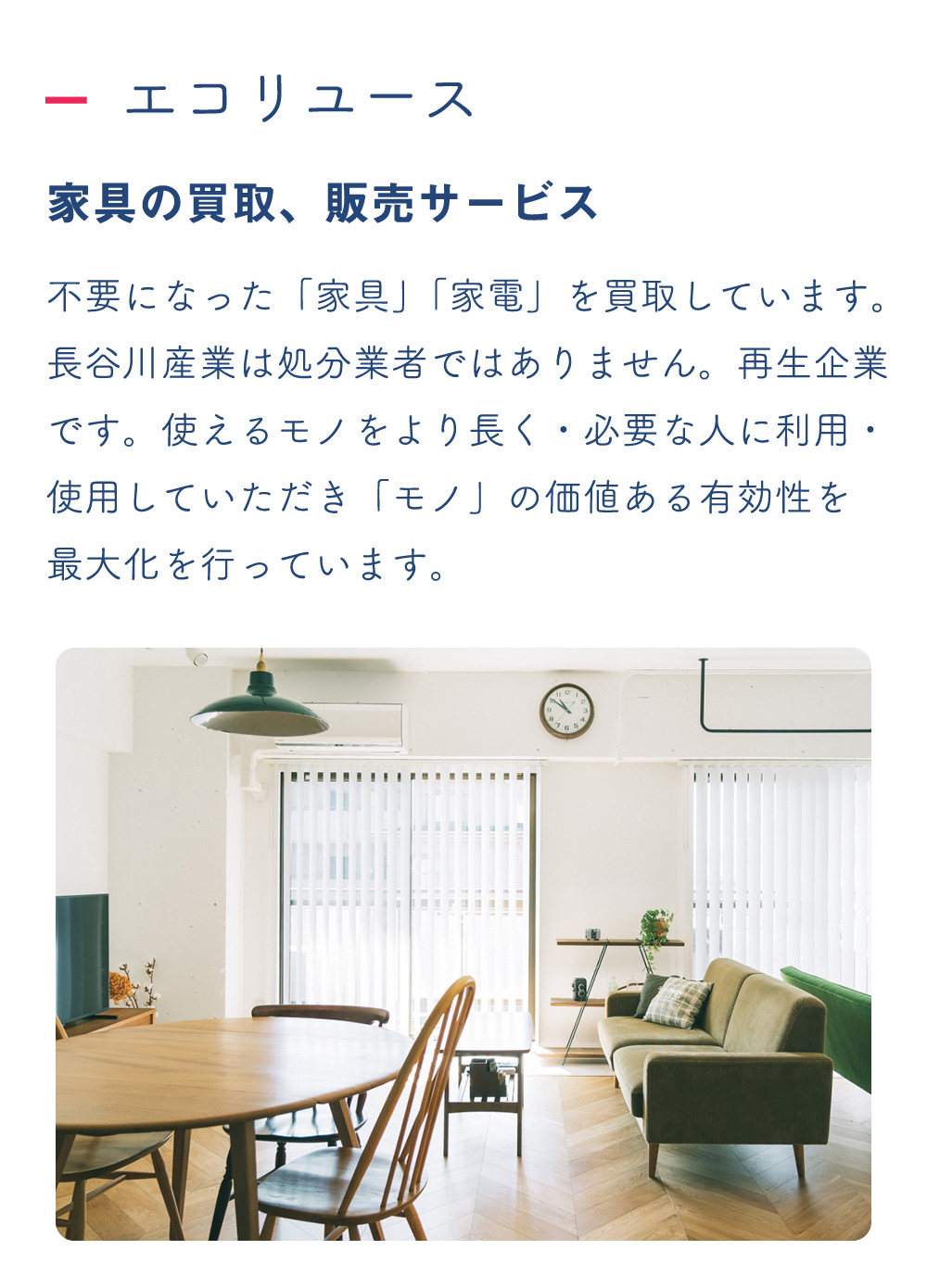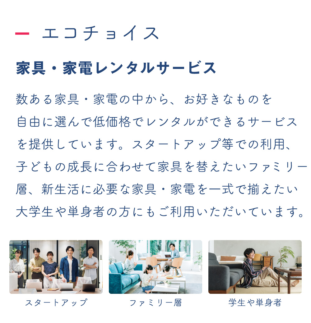 エコチョイス 家具・家電レンタルサービス 数ある家具・家電の中から、お好きなものを自由に選んで低価格でレンタルができるサービスを提供しています。スタートアップ等での利用、子供の成長に合わせて家具を替えたいファミリー層、申請かるに必要な家具・家電を一式で揃えたい大学生や単身者の方にもご利用いただいています。