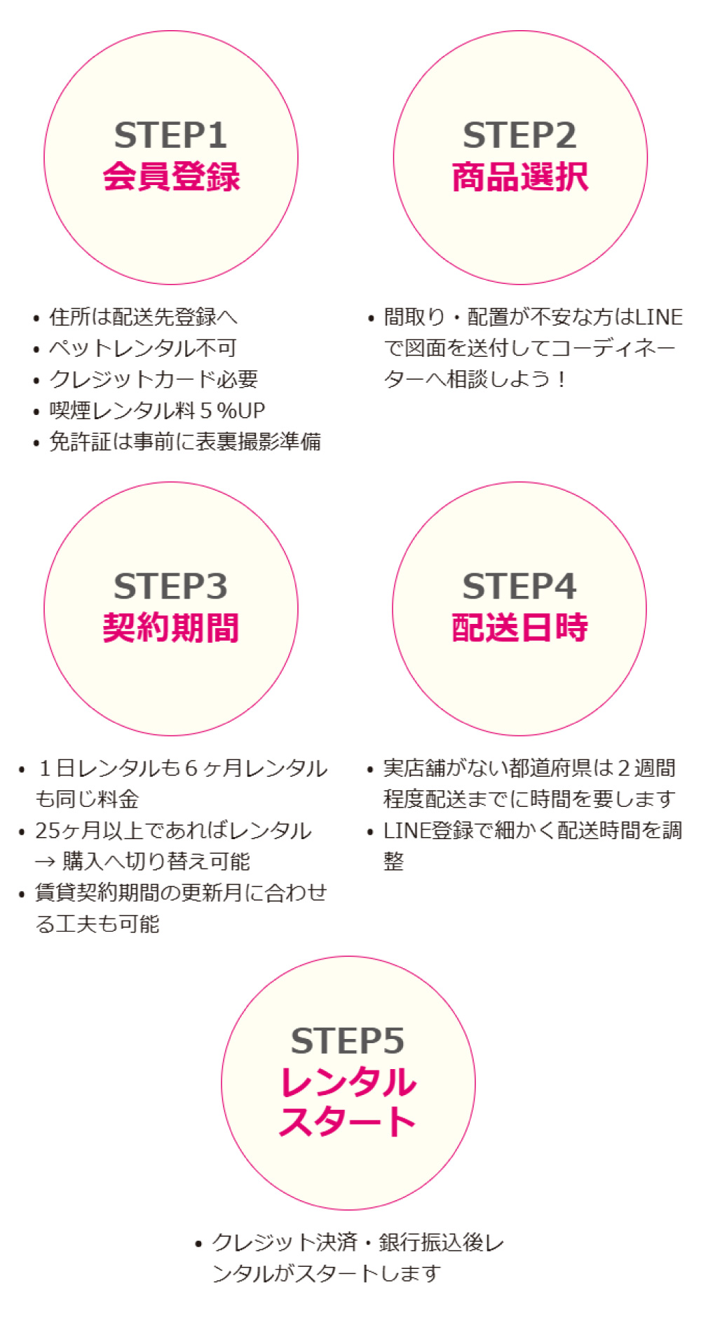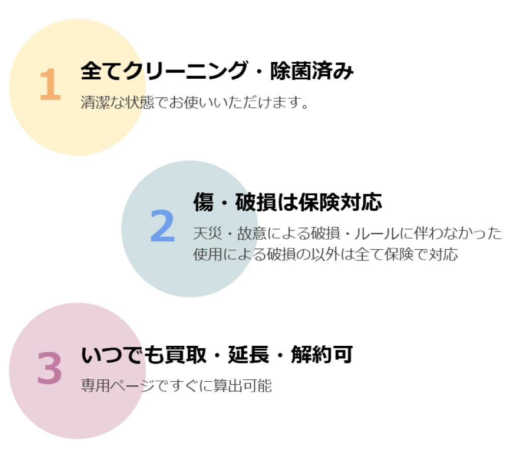 STEP3 契約期間 1日レンタルも6か月レンタルも同じ料金 25か月以上であればレンタル→購入へ切り替え可能 賃貸契約期間の更新月に合わせる工夫も可能