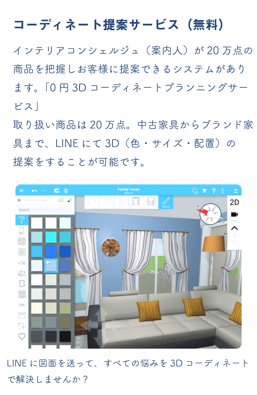 コーディネート提案サービス インテリアコンシェルジュ(案内人)が20万点の商品を把握しお客様に提案できるシステムがあります。「0円3Dコーディネートプランニングサービス」取扱商品は20万点。中古家具からブランド家具まで、LINEにて3D(色・サイズ・配置)の提案をすることが可能です。LINEに図面を送って、すべての悩みを3Dコーディネートで解決しませんか?