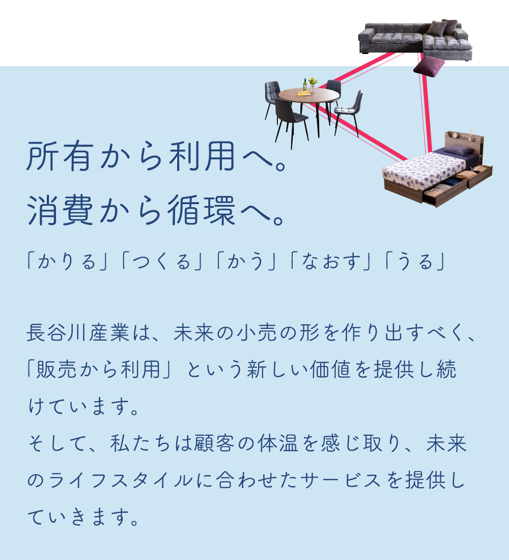 所有から利用へ。消費から循環へ。「かりる」「つくる」「かう」「なおす」「うる」長谷川産業は、未来の小売の形を作り出すべく、「販売から利用」という新しい価値を提供し続けています。そして、私たちは顧客の体温を感じ取り、未来のライフスタイルに合わせたサービスを提供していきます。