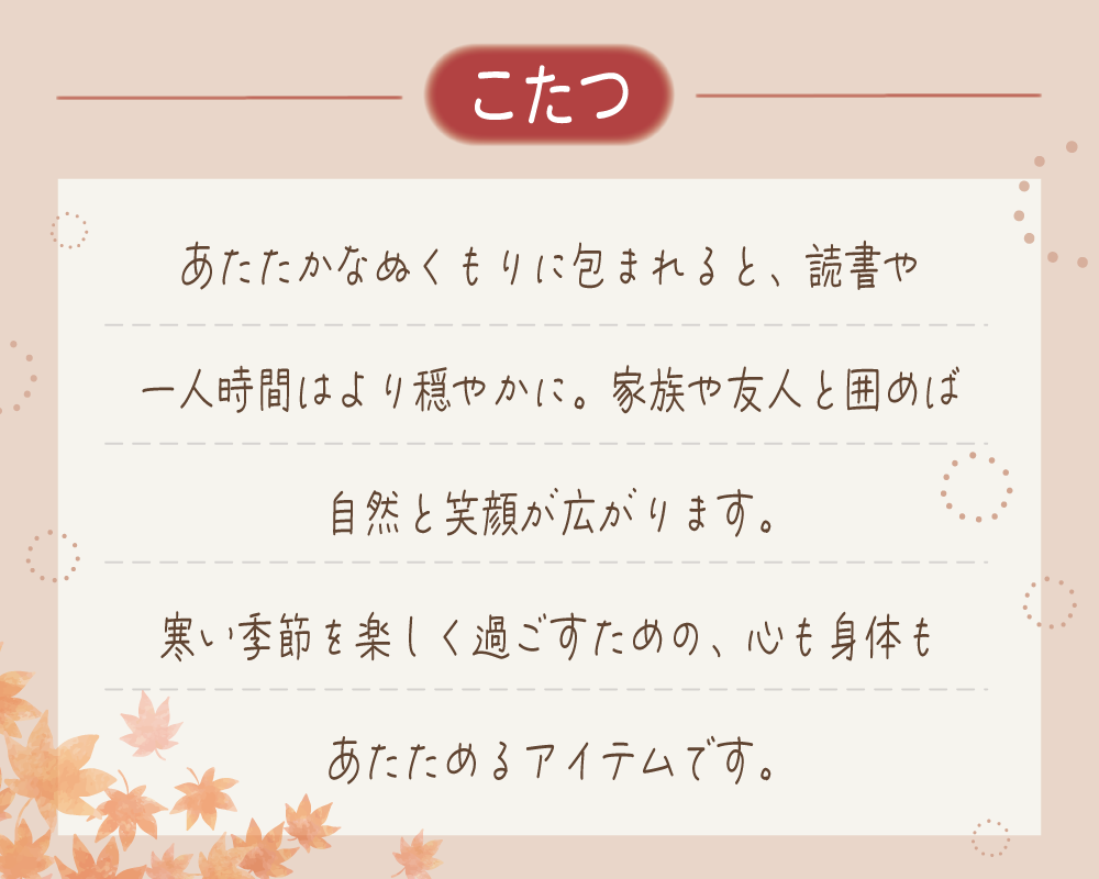 カジュアルこたつテーブル ワーム 105×7521,989円(10%税込)105cm幅 こたつテーブル トリム ナチュラル38,489円(10%税込)105cm円形 こたつテーブル スタンレー ブラウン54,989円(10%税込)75cm幅 円形こたつテーブル ブラン2 ホワイト32,989円(10%税込)120cm幅ロータイプ こたつテーブル グレイス49,489円(10%税込)ラメ入りこたつ布団(190×190)5,500円(10%税込)こたつ布団 薄かけ ジオ 正方形(190×190)8,789円(10%税込)花柄こたつ布団 マーリ 190×2404,389円(10%税込)ふっくらキルトこたつ布団 リュクス 正方形(190×190)7,689円(10%税込)