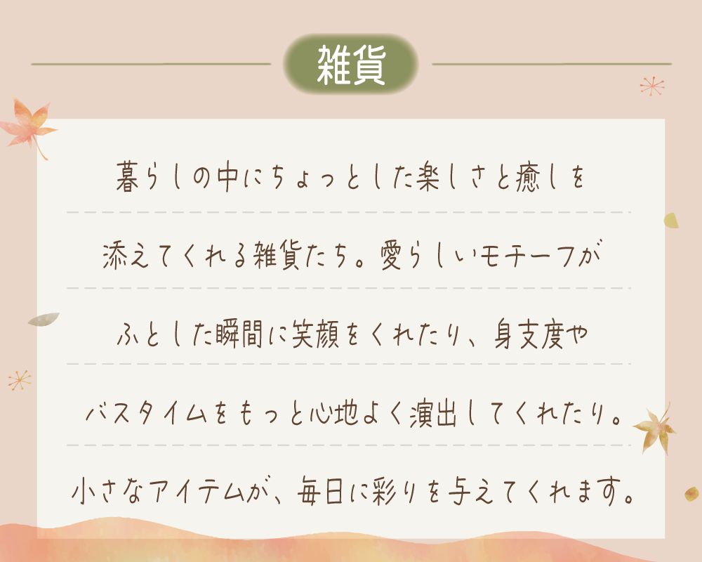 アニマルキーホルダー1,100円(10%税込)キャンバスサガラトートバッグ2,189円(10%税込)キャンバスサガラポーチ878円(10%税込)ニットバッグ クマ シュナウザー ネコ シマエナガ748円(10%税込)ソフトモール腹巻き658円(10%税込)金木犀 キンモクセイ ハンド&ボディソープ880円(10%税込)金木犀 キンモクセイ 炭酸バスタブレット330円(10%税込)バスボム もぎたてゆず/ゆずとはちみつ638円(10%税込)刺繍ルームソックス548円(10%税込)蓄熱式湯たんぽ ミニウォーマー1,969円(10%税込)