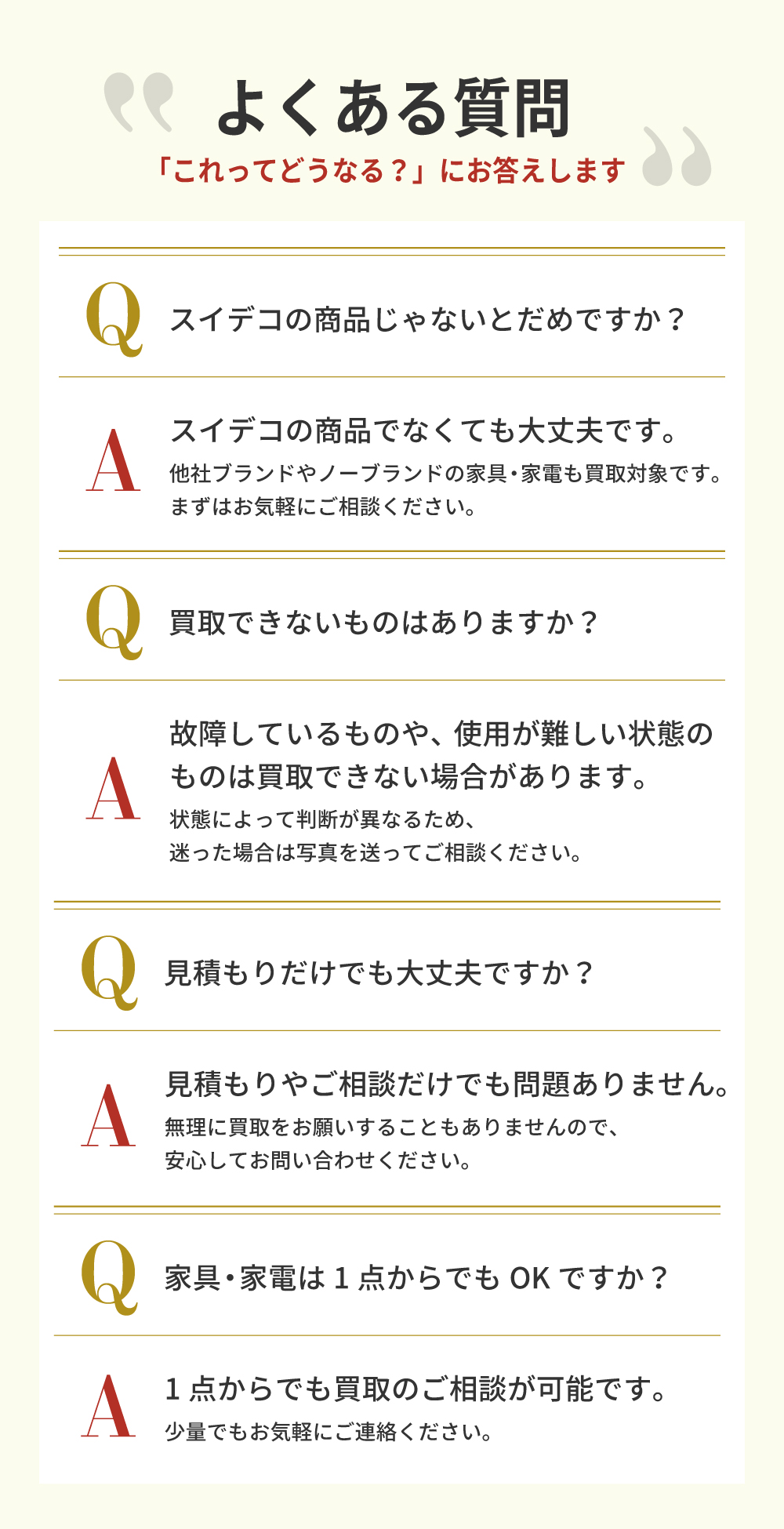 A.スイデコの商品でなくても大丈夫です。他社ブランドやノーブランドの家具・家電も買取対象です。まずはお気軽にご相談ください。