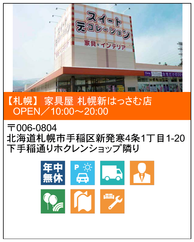 ![]() 家具屋 札幌新はっさむ店 道内3店舗目! かりる、つくる、かう、なおす、うる |