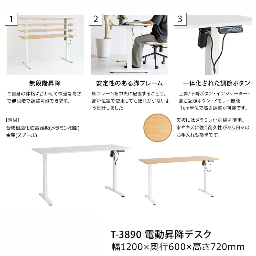 120cm幅電動昇降デスク T-3890 ナチュラル×ホワイト ホワイト×ホワイト【お客様組み立て品】【お取り寄せ品】の商品詳細