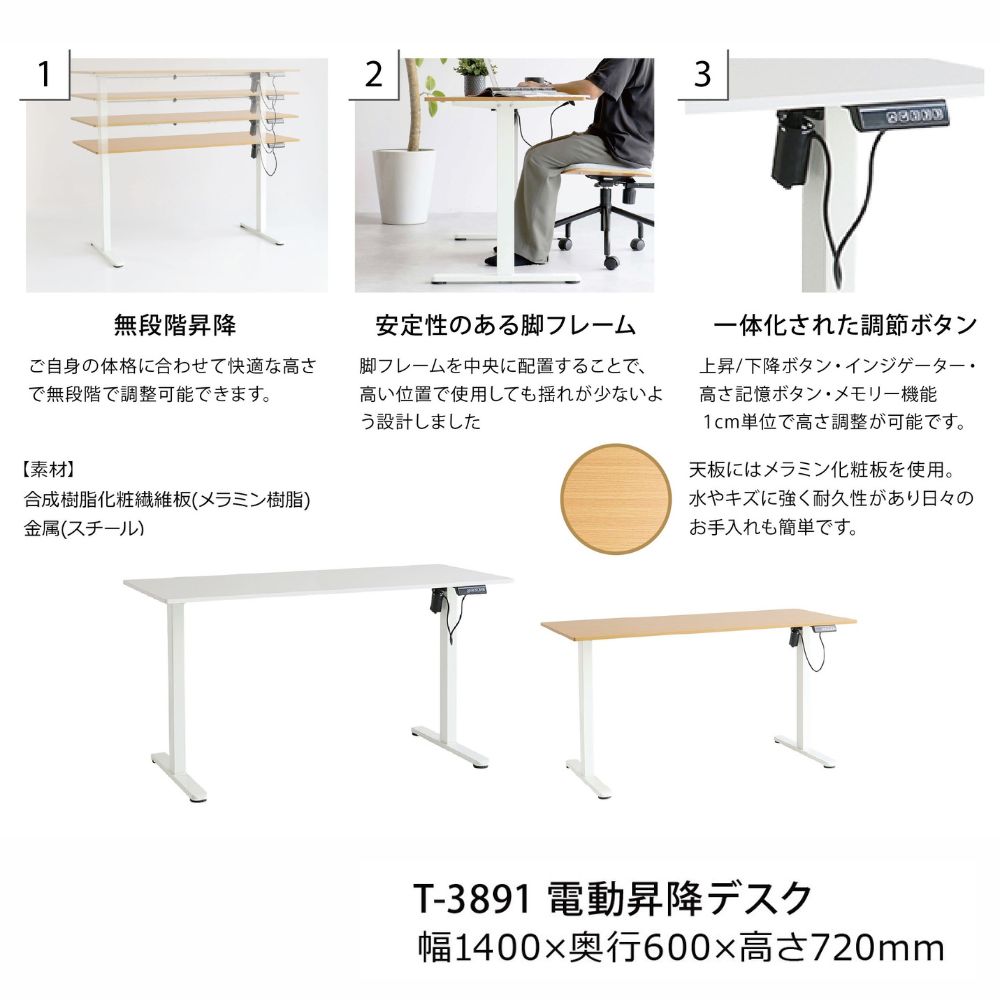 140cm幅電動昇降デスク T-3891 ナチュラル×ホワイト ホワイト×ホワイト【お客様組み立て品】【お取り寄せ品】