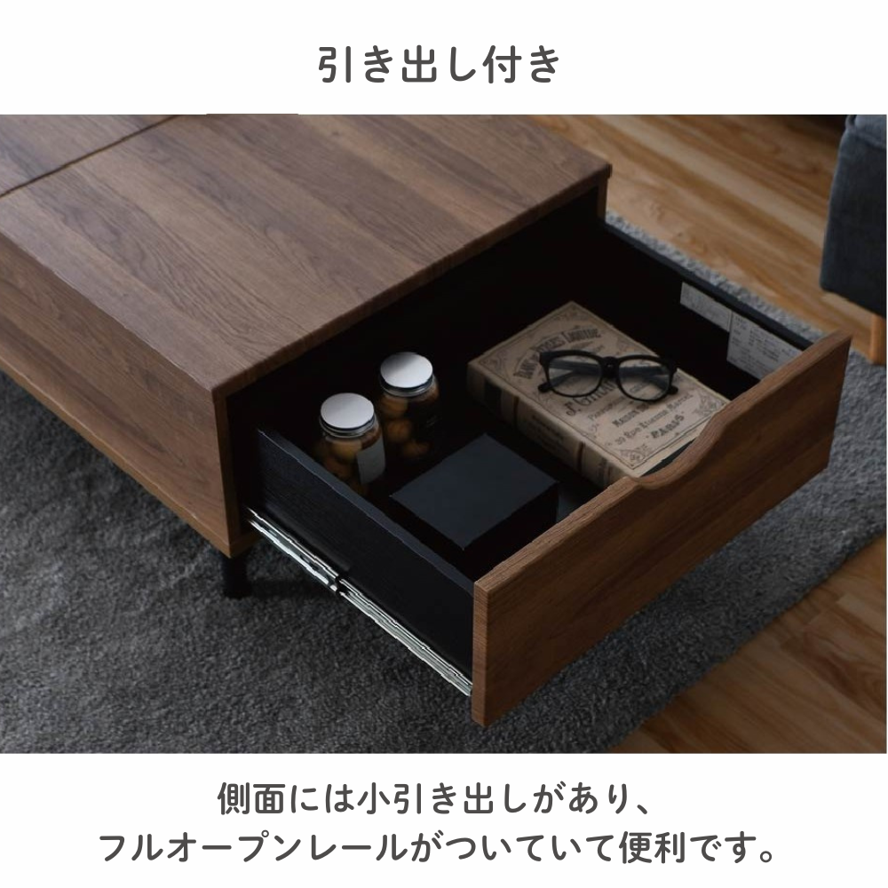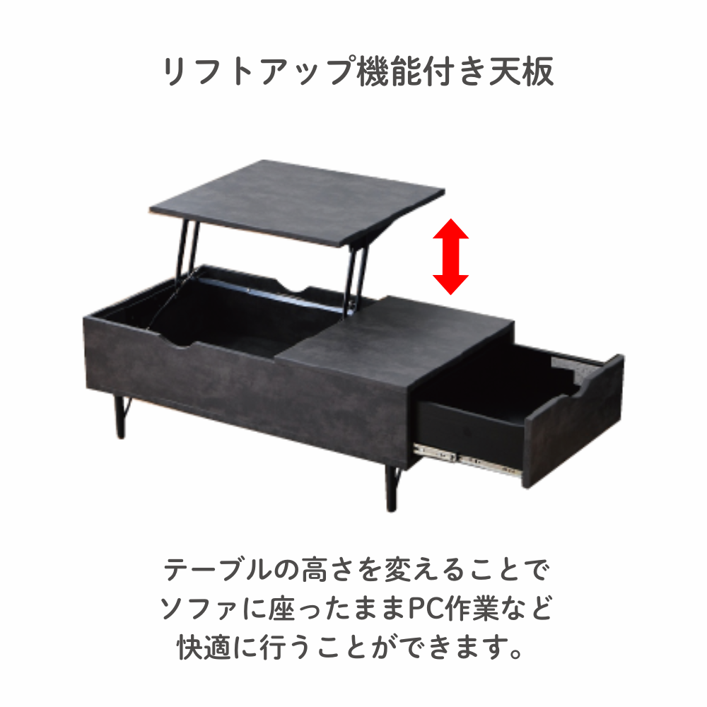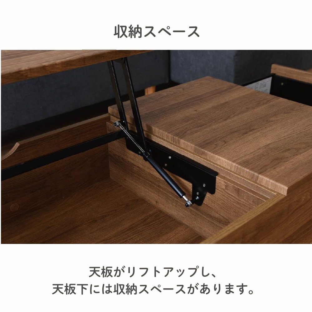 沖縄エリア配送不可天板がリフトアップする機能的なセンターテーブルです。ソファに座ったまま作業がしやすく、天板下には便利な収納スペースがあります。