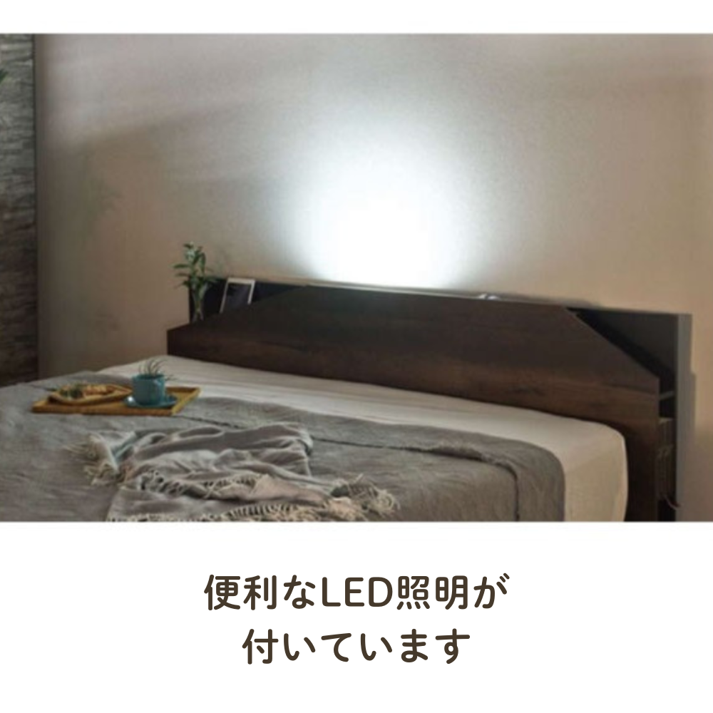ヘッドボードには便利なLED照明と2口コンセントを備え、スマートフォンなどの充電や小物の収納に役立ちます。脚付き(LEGタイプ)のデザインは、お部屋に開放感を与え、お掃除もしやすいのが特徴です。