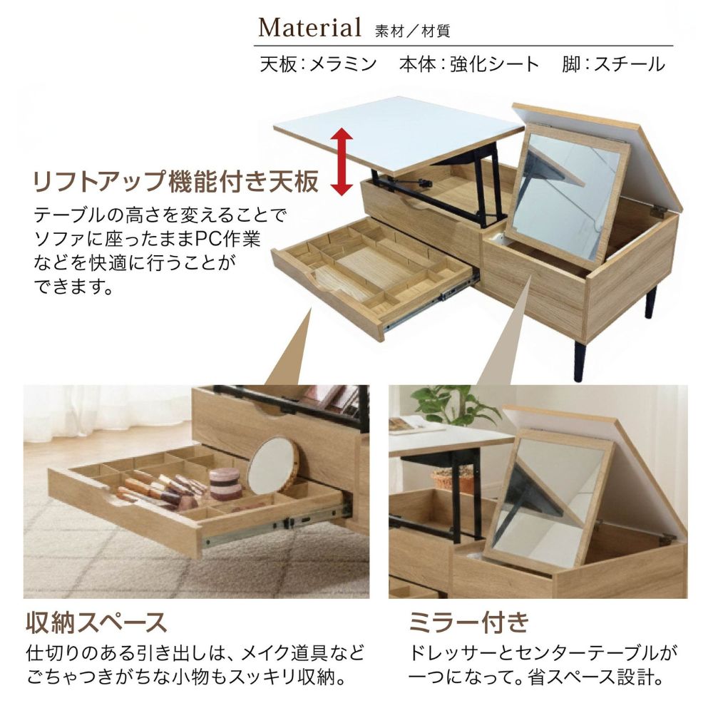 ミラー付きリフトテーブル リリー ホワイトウッド ブラック ホワイト【お取り寄せ品】の商品詳細