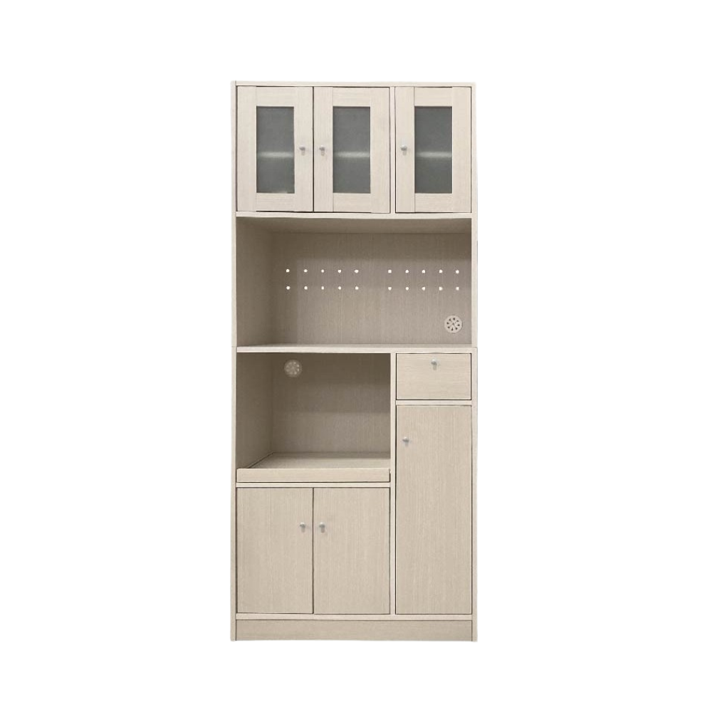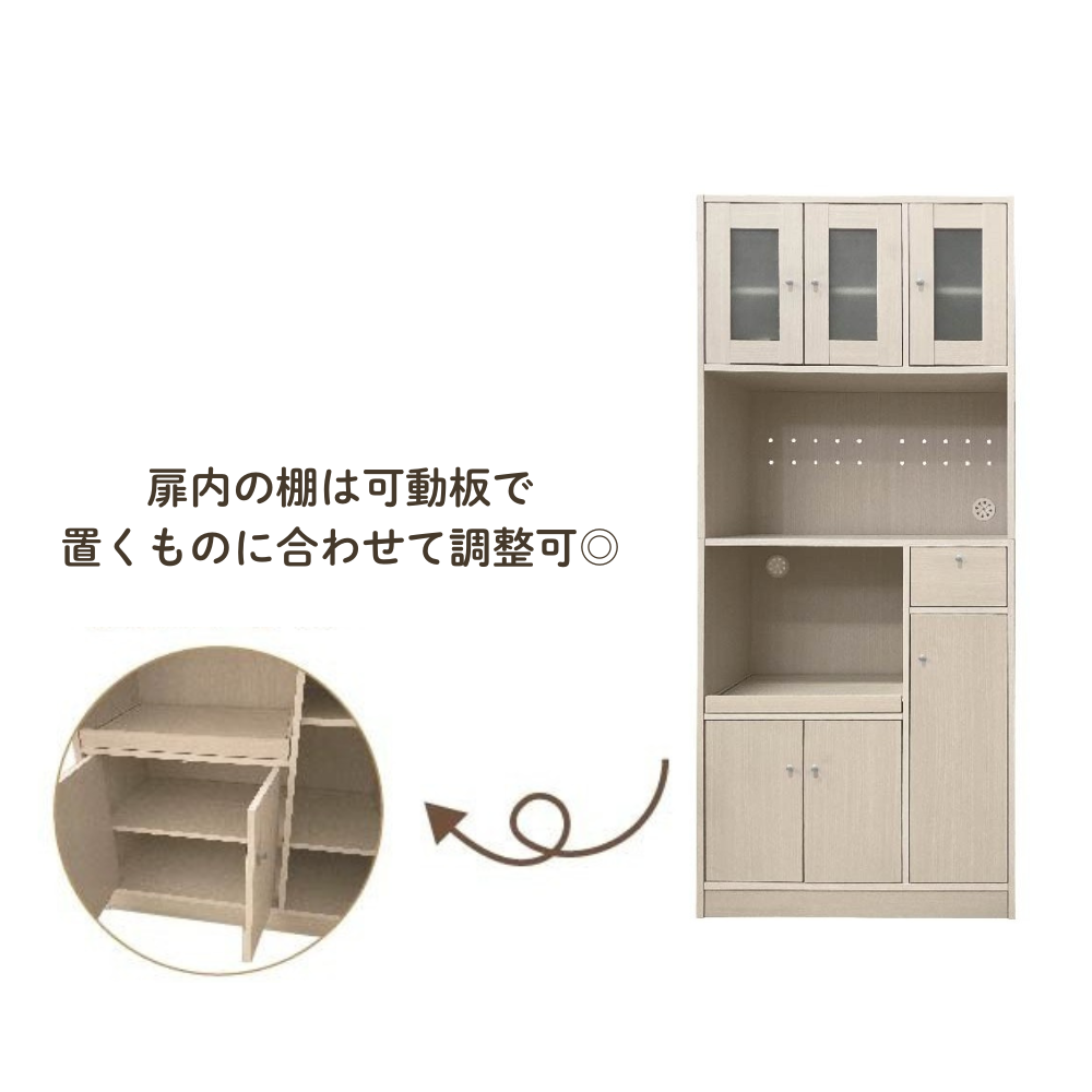食器棚としては、それぞれの収納スペースがくぎられていて使いやすいです!炊飯器をMAXに引き出しても蒸気の穴が棚にかかるので、炊飯器を逆向きにして炊いています。