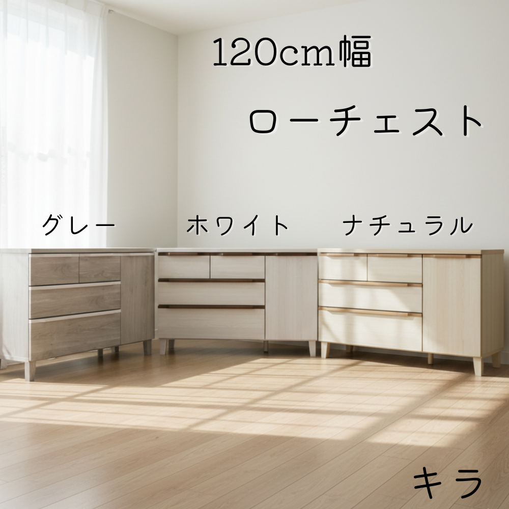 キラ 3段ローチェスト 幅120cm ホワイト グレー ナチュラル【お取り寄せ品】