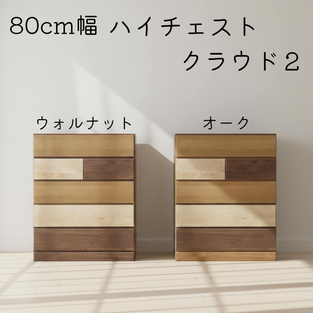 80cm幅 5段ハイチェスト クラウド2 日本製 ウォルナット オーク【お取り寄せ品】